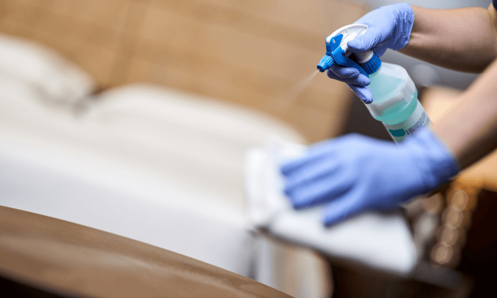- We will use a hospital-grade disinfectant on all surfaces we typically clean throughout your home. (Counter tops, bathroom surfaces, door knobs, light switches, refrigerator handle, etc.) Be aware that when disinfecting surfaces the disinfectant needs to sit wet on the surface to work properly. You may notice us using more cleaner than normal and not drying surfaces.
